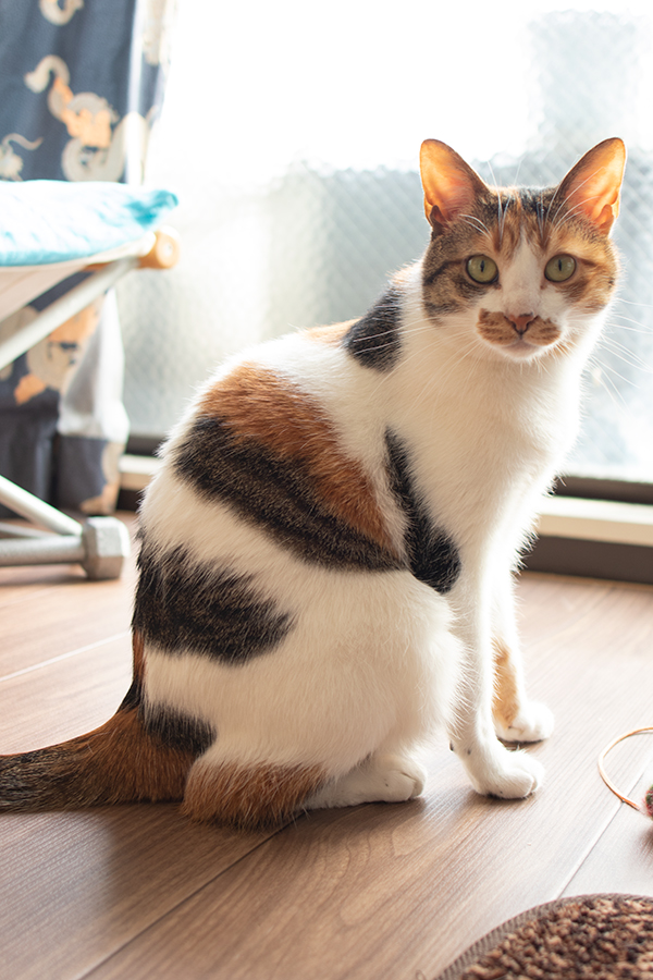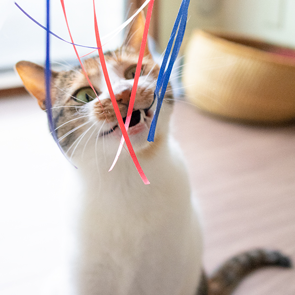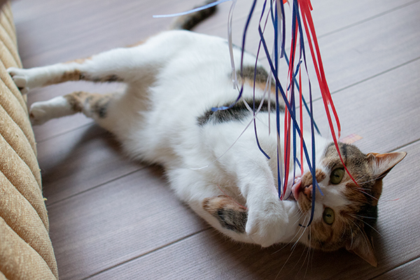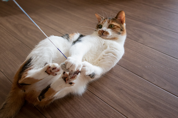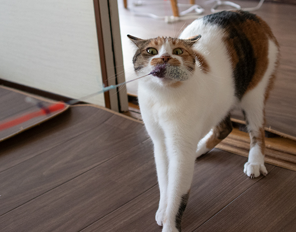 ヒモが好きなミケーネたん。オモチャを放置するとヒモを食べちゃうので要注意。