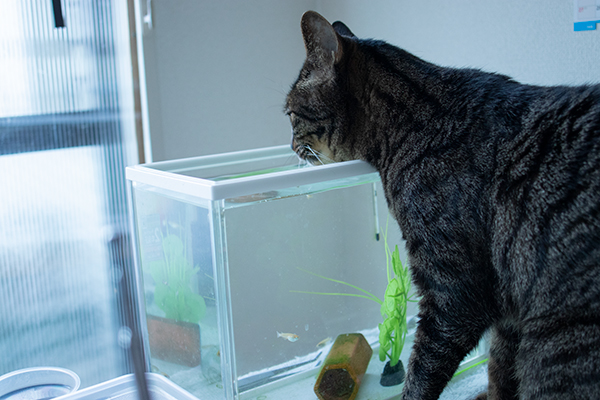 ひなたに置いた水槽、昼間は水温が28度くらいになる(今日の東京の最高気温は7度)。生温い水を飲むビーたん。