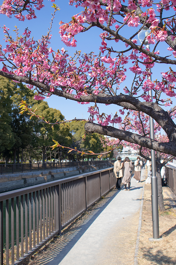 木場公園横の河津桜咲き始め。遊歩道では撮影会。