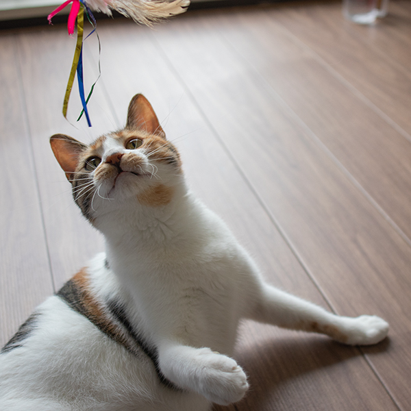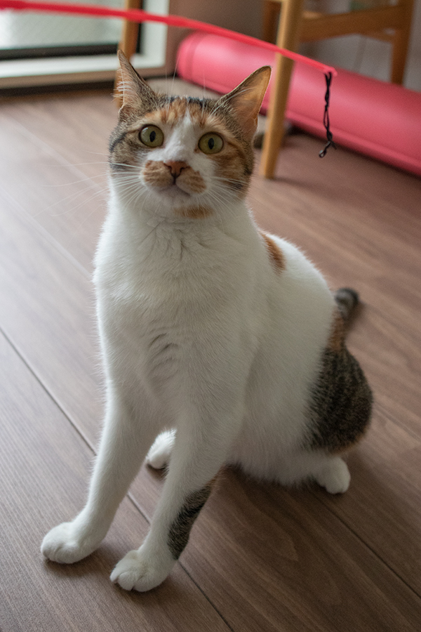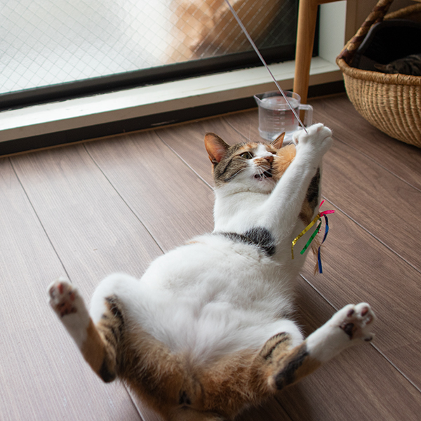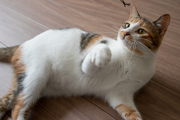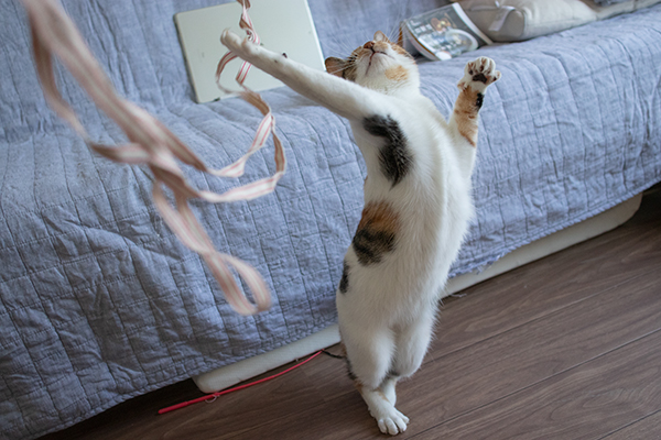 今日のミケーネたん。ただの「ひも」が大ヒット。よく遊びます。