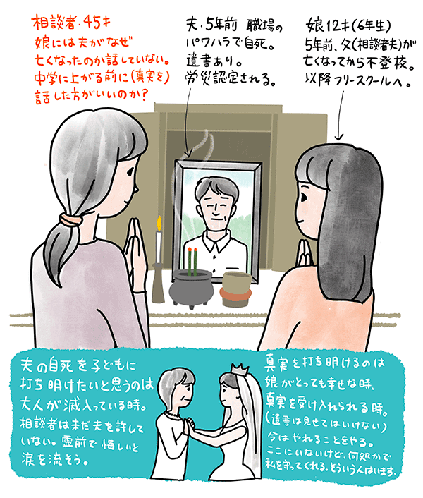 娘は夫が亡くなり不登校になった。中学入学前に夫が自殺した事を話すべきか、45歳女性のご相談。