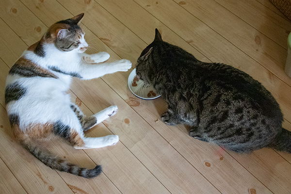 ビーたんの残すゴハンを狙ってる。