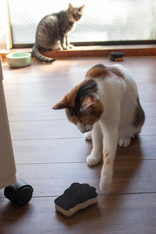 肉球柄グルーミングブラシを何故か敵認定してるミケーネ。