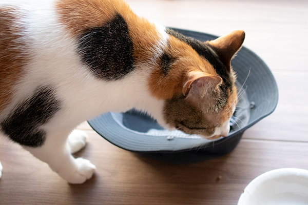 ミカリちゃんの毛がついた帽子をチェックするミケーネ。