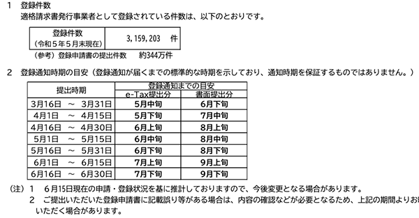 引用:適格請求書発行事業者の登録件数及び登録通知時期の目安について国税庁PDFです。