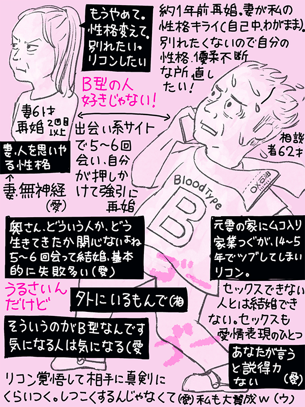 妻が「相談者の自己中でわがままな性格が嫌い、B型の人はあまり好きじゃない」と