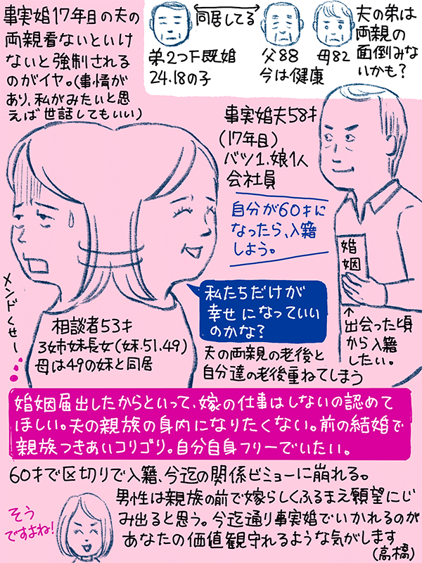 事実婚17年目、58才の夫が60才になったら入籍しようと言ってるが、嫁らしくふるまうとか、夫の両親を面倒みるのは嫌。