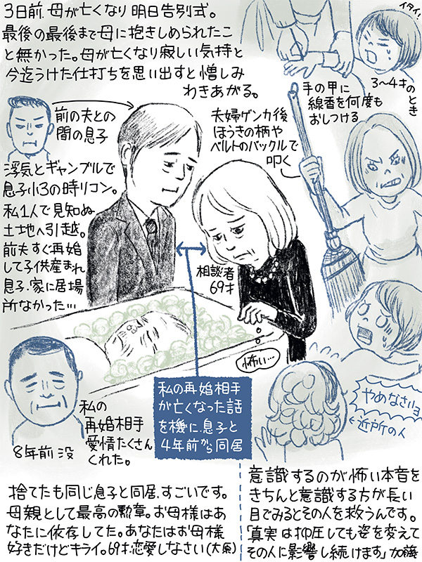 3日前に母が亡くなり明日告別式だが、寂しいと思う気持ちと、今まで受けた仕打ちを思い出し憎しみが湧き上がる。