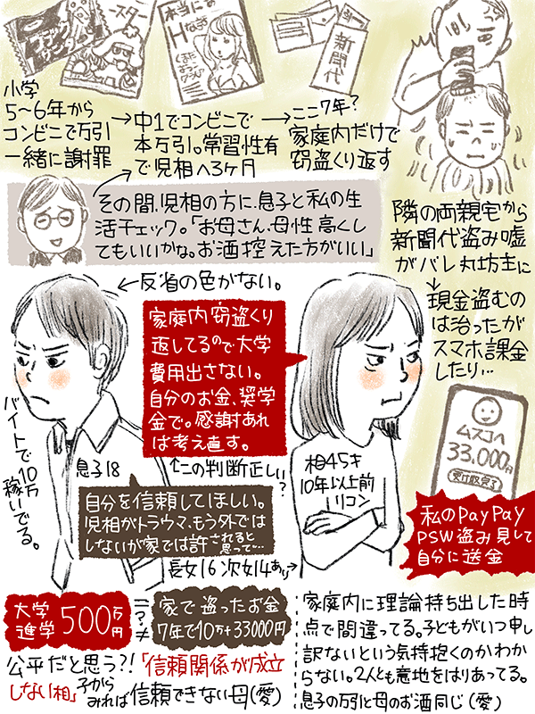息子が小5から万引き、児相へ行ってから外での窃盗はなくなったが家庭内窃盗を繰り返しているので「大学の費用は出さない、奨学金とるなりして自分のお金で行くように」と息子に言ったがこの判断は正しかったのか?という45歳女性のご相談。