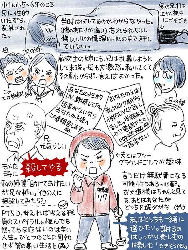 小学生1年と5〜6年の時に兄から性的暴行を受けた。思い出しでも忘れるよう努力したが、忘れられない。悔しい、心の傷が深い。