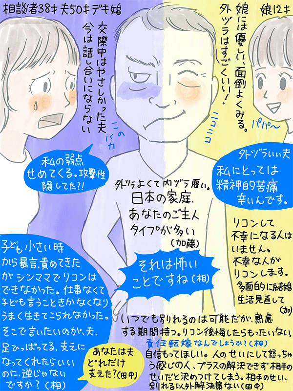 外ヅラはいいが私に対しては攻撃性、二面性のある夫が精神的にツラくて苦しい。どうしたら?という38才女性のご相談。