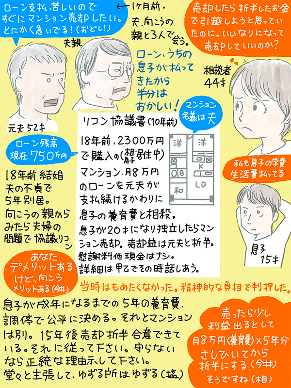 10年前に離婚した時、マンションローンがあり元夫が養育費がわりに支払っていたが先月、その支払い苦しいのでマンションを早急に売却したいと言ってきた。向こうの親が「離婚した後ローン支払ってきたのは息子(元夫)、売却益半分にわけるのはおかしい」と言い出しますます不安に。いいなりになって売却していいものか?という44歳女性のご相談。