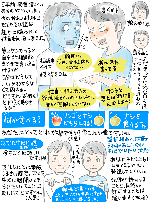 発達障がい向けの書籍やサイト、あるいは夫婦カウンセリングで対処法は見つかりそうな気もするけど。