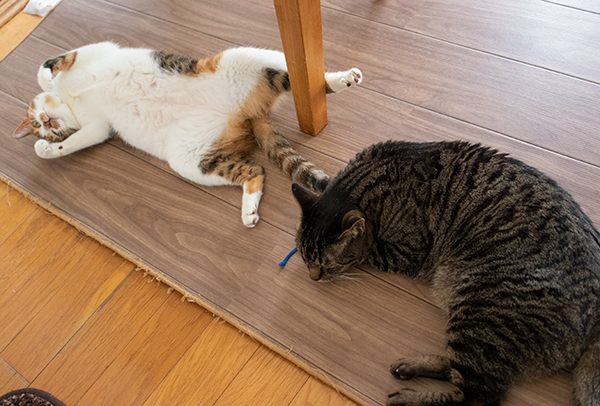 ビーたんが抱いて離さないので、フテ寝のミケーネ。