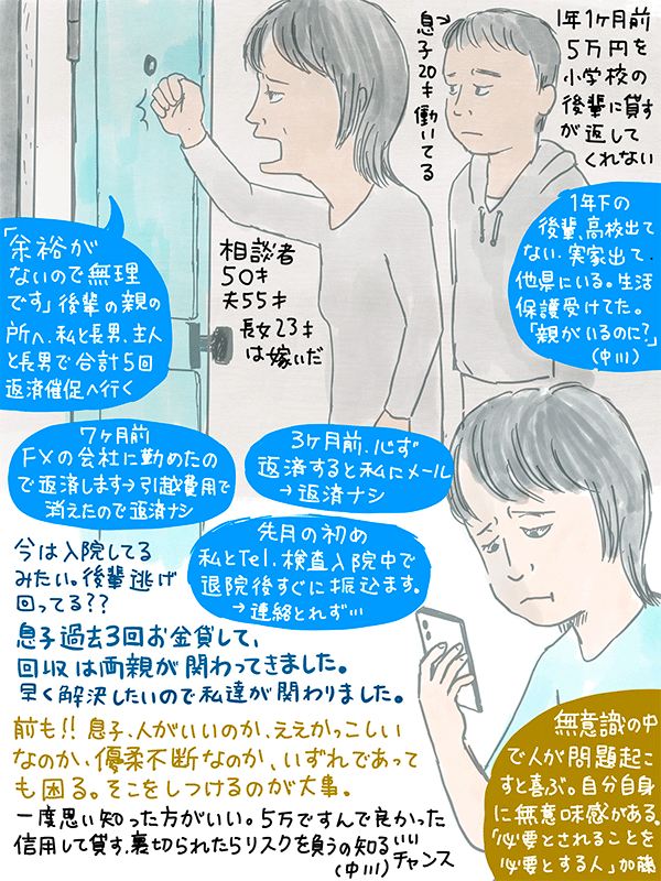 夫と私、かわりがわり息子につきそい5回、相手の両親宅に返済催促へ行ったが「余裕がないので無理です」。借りた本人は逃げ回ってる。