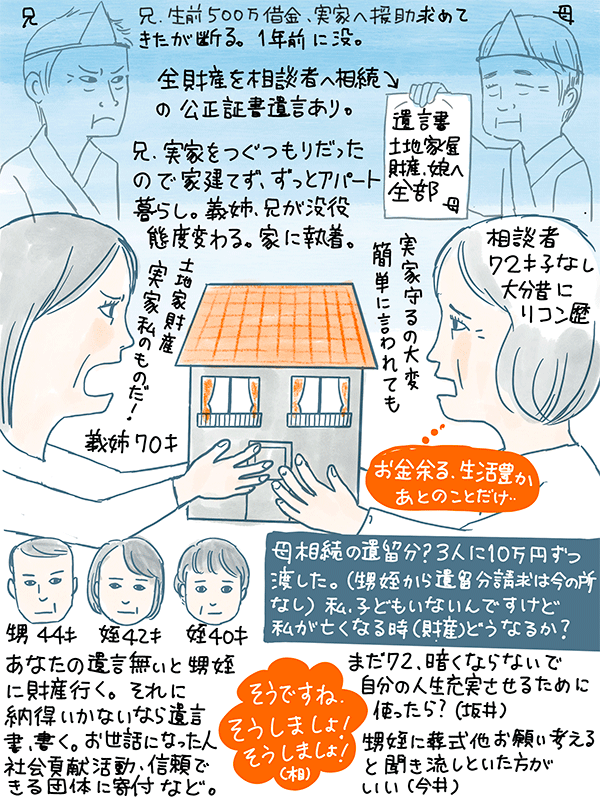 兄嫁が「相談者は実家(の面倒)をみてるけど、あなたの家になることはない。実家、土地家財産は私(兄嫁)のものだ」と言い出した。今後どうしたら?という72才女性のご相談。
