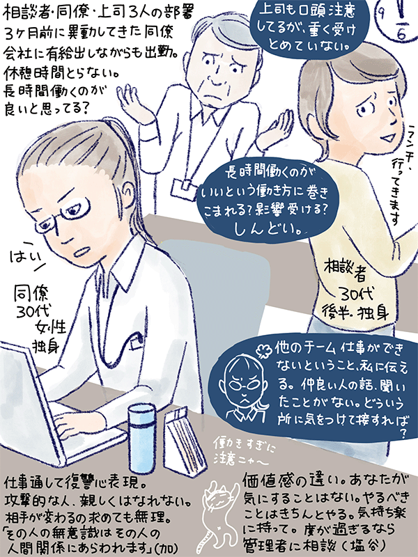 休憩時間を取らない、有給申請しても出社して働く同僚と、仕事のスタンスが合わない。