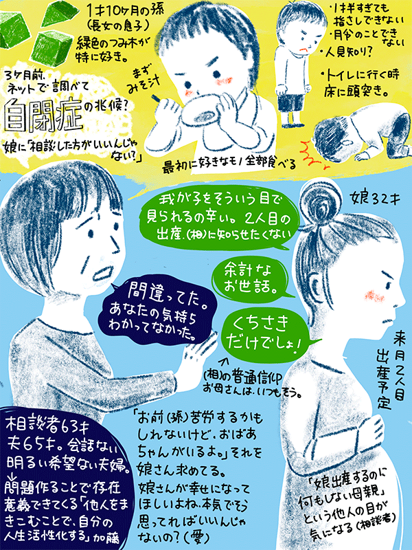 娘の長男(1歳10ヶ月)の行動の相談をされネットで調べたら「自閉症」の兆候あるんじゃないか?と感じた。そのことを娘に伝えたら「我が子をそういう目で見られてるの辛い、二人目の出産、今の状況では知らせたくない」と言われた。話し合っても平行線のままという63歳女性のご相談。