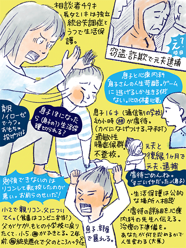 息子が小二の時離婚、元夫と相談者の間を行ったり来たりの息子。過敏性腸症候群、不登校で今は通信制の学校だが、勉強ができないと部屋で暴れた。心療内科の治療も通ってない。息子が18になったら生活保護も打ち切られる?これから息子とどう接したらいいか?という49歳女性のご相談。