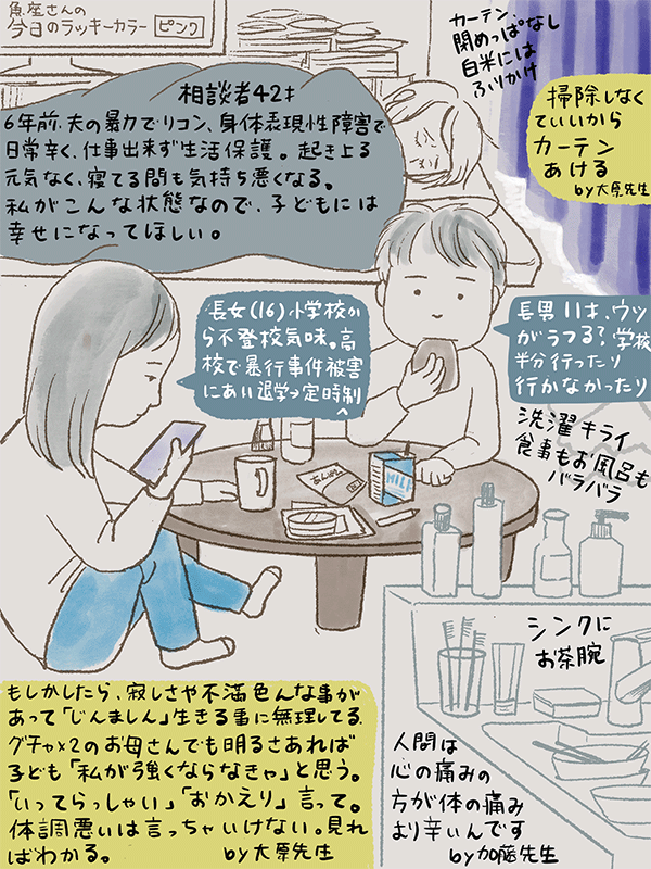 うつ病の一種、身体性表現障害で仕事できず生活保護受けている。病気抱えながら、なるべくふつうのきちんとしたお母さんに近づけるにはどうしたら?という42歳女性のご相談。