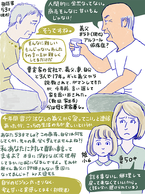 妻の実家稼業で義父、妻、自分3人で17年働いてきた。父から説教されずっと辛抱してきたが4年前口答えをして家を追い出され自分は実家へ。音信不通だったが4年ぶりに義父から「戻ってこい」と言われたものの今の生活も楽しく、妻からは「無理して戻ってこなくてもいい」と言われ。という53歳男性のご相談。くわしくはコチラいつもありがとうございます。
