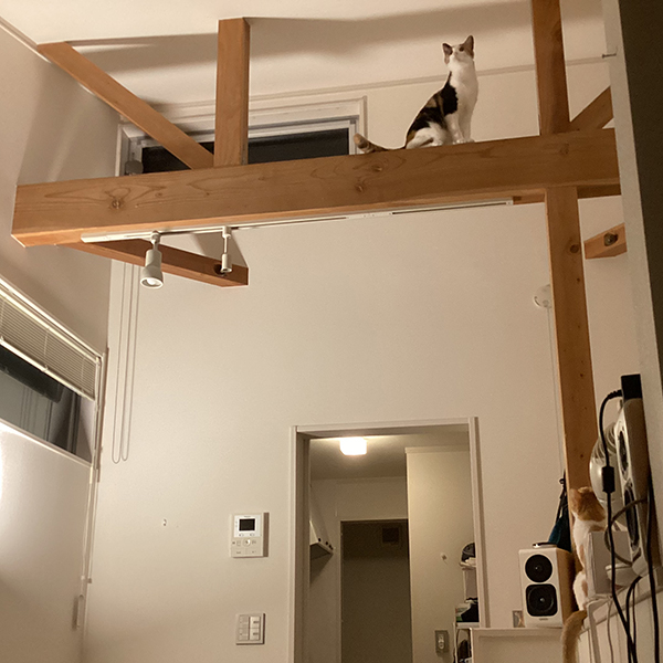 新居の梁、コウメが一番乗り。