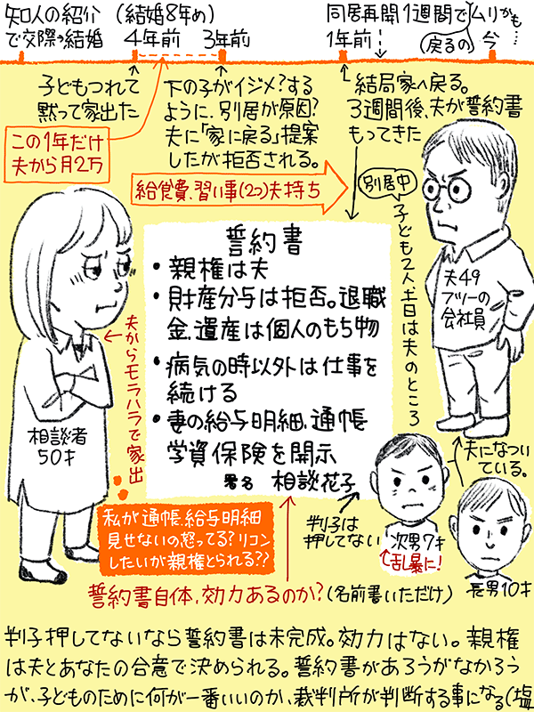 が、家を出て1年で、子供が他の子を傷付けるように。別居が原因?と思い、夫に家に戻る事を提案したが拒否された。結局家に戻ったが夫が誓約書を持ってきて理不尽な内容だったがサインをしてしまった。(判子は押してない)