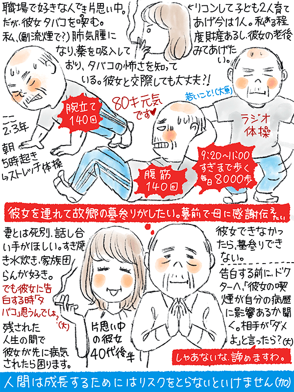 職場の40代後半女性に片思い。だが、彼女は煙草を喫んでいる。自分は肺気腫で薬を吸入してるので彼女を交際しても大丈夫か?