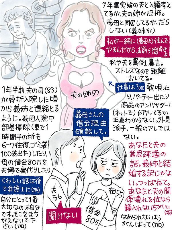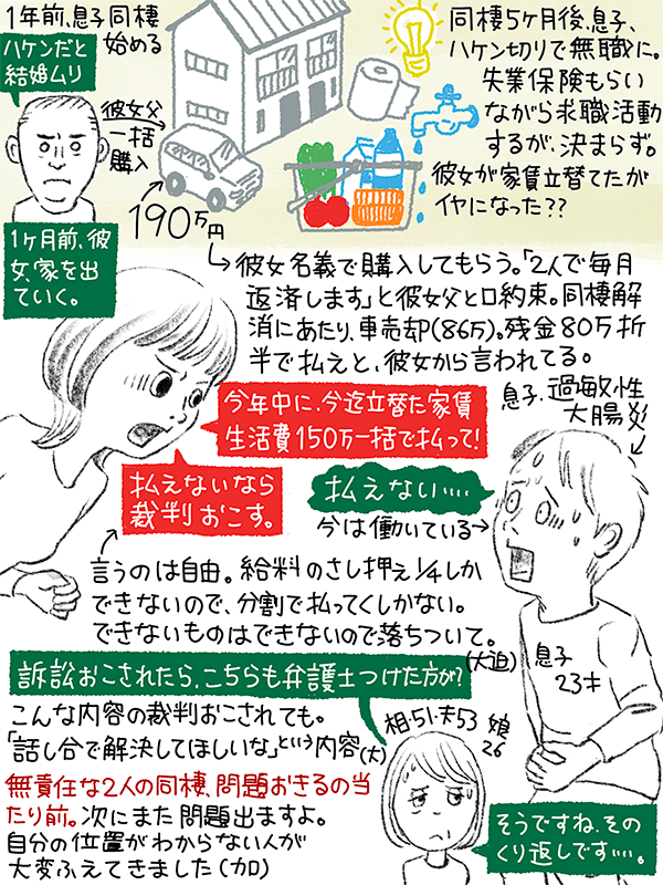 同棲解消で車を売却(86万)したが残金80万を折半、立て替えた家賃生活費150万を一括で払え、払えなければ裁判起こすと息子は彼女から言われている。息子は払えないと言ってるが…という51歳女性のご相談。