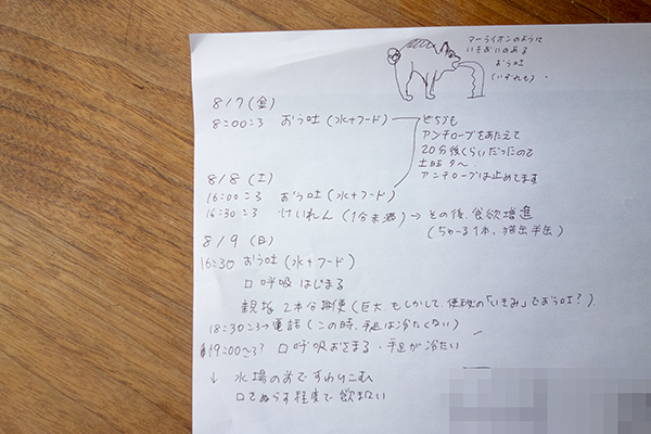 16日朝、動物病院で診察。触診で、腹水の可能性はあるかもしれないけど溜まってはいない。輸液と強制給餌は続行になりました。