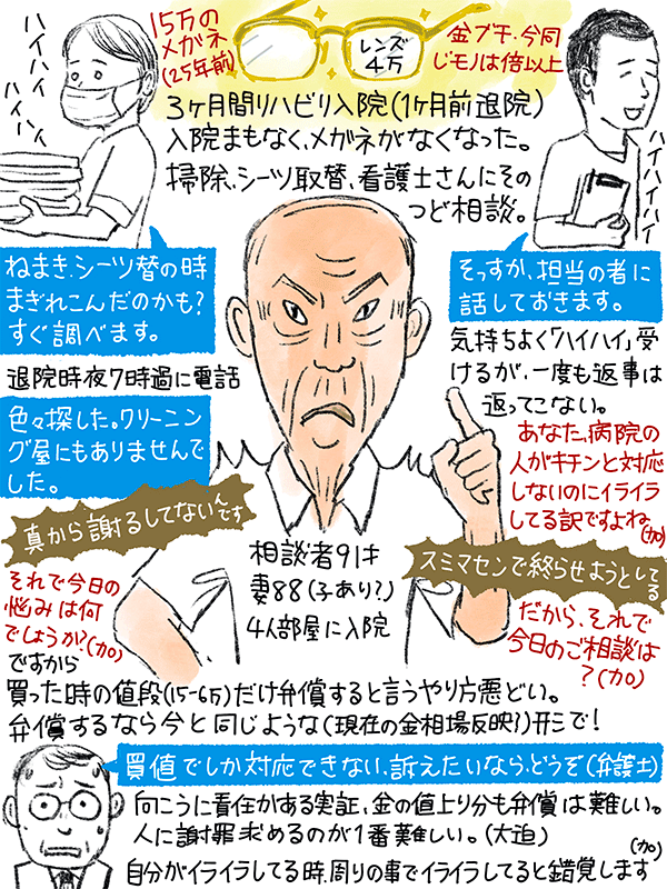 あちらの顧問弁護士から「メガネを弁償する」と言われたが、二十五年前に作った金縁メガネ、今似たものは値段が倍以上。向こうのやり方悪どいという91歳男性のご相談。