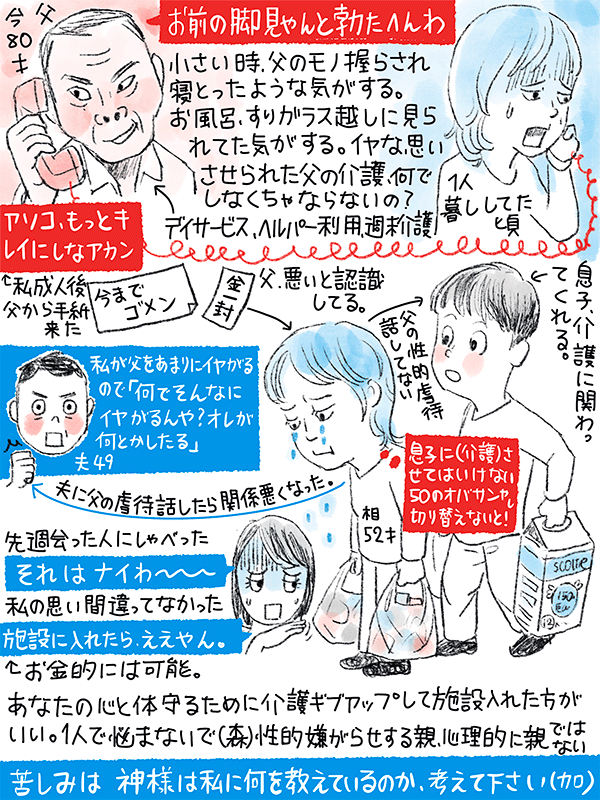 一人暮らしする父の介護が必要になってきたが、幼少時から性的嫌がらせを受け苦しい思いしてきたので介護したくないという52歳女性のご相談。
