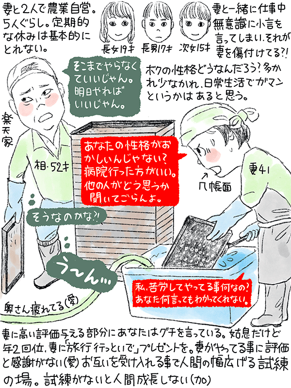 妻と一緒に自営の農業をしているが仕事中、無意識に小言を言ってしまい、それが妻には嫌な事に聞こえるみたいで。知らず知らずのうちに妻を傷つけ続ける僕の性格どうなんだろう?