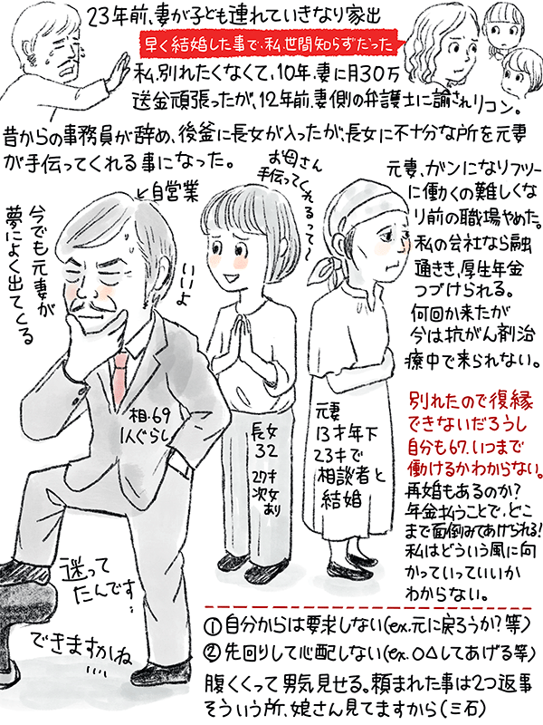 自営業で、長女が事務をやってくれているが、長女で不十分なところを元妻が手伝ってくれている。がん治療で前の勤務先を辞めたが、私のところなら融通が利き厚生年金を払ってあげられる。