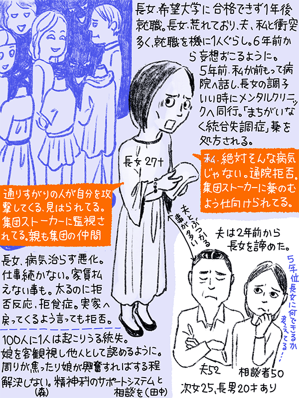 5年前から長女に妄想が起こり、メンタルクリニックへ同行したが「自分は絶対そんな病気じゃない」と服薬も通院も拒否。