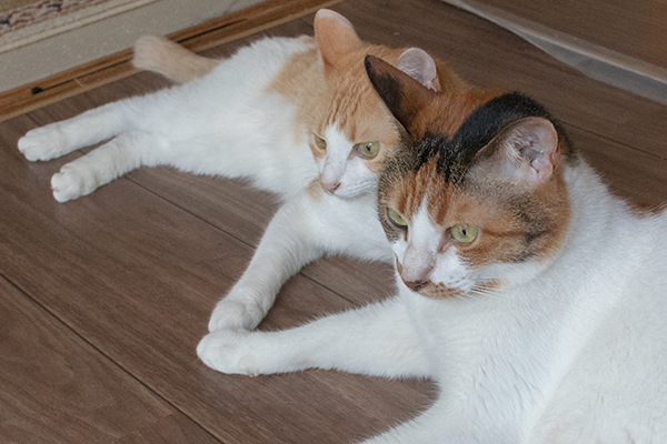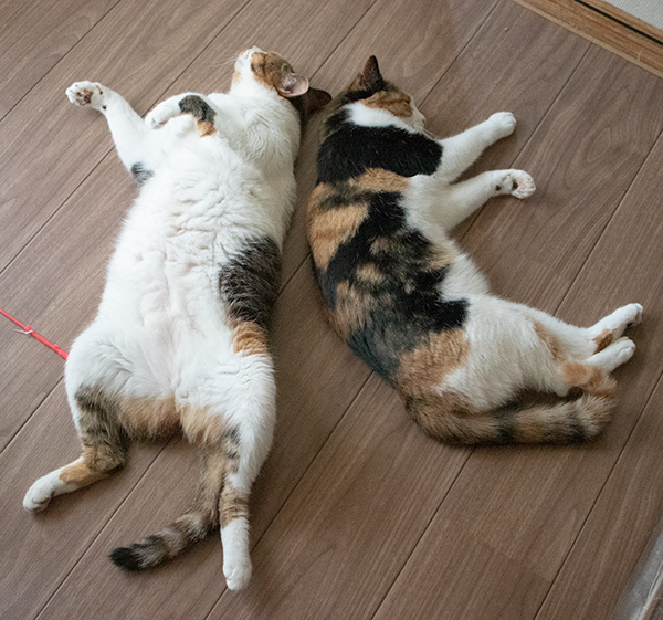 東京は梅雨明けのような暑さ。エアコンの下で涼む猫ズ。