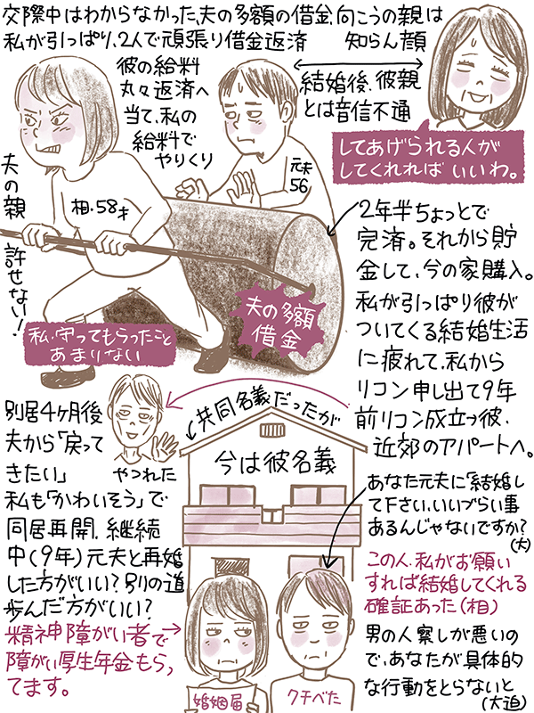 結婚後に夫の多額の借金が発覚。私も夫もすごく働いて二年半で借金完済したのち貯金して家を建てたが、9年前、私主導の結婚生活に疲れ私から離婚を申し出。夫が出て行きアパートへ。