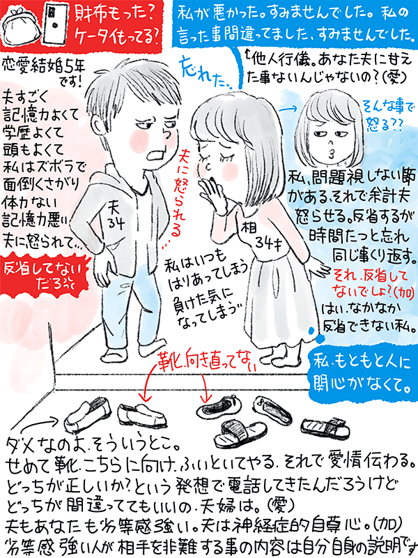 夫は学歴も記憶力も頭もすごくよくて、私はズボラで面倒くさがり、体力もなく記憶力も悪い。忘れ物が多く、夫をしょっちゅう怒らせているが私はそれを問題視してないので夫を余計怒らせてる。離婚する気はないが、夫に言われたことを反省してもじかんがたつと忘れ繰り返してしまうという34歳女性のご相談。