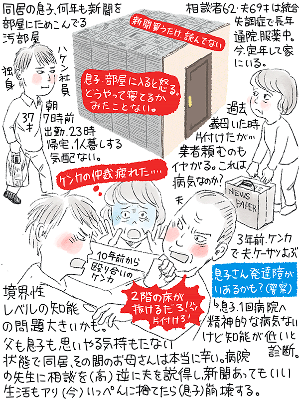 息子が自分の部屋に新聞をためこんで汚部屋。夫が注意すると殴り合いに。それを私が止めに入るが、続いて疲れてきた。
