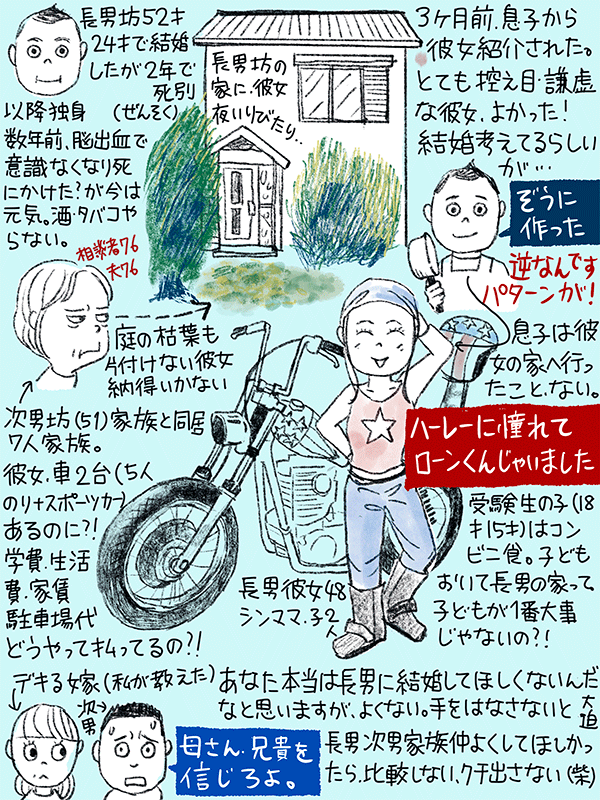 車も2台あるのに、ハーレーもローンを組んで購入。シンママなのに生活費、家賃、学費どうやって払っているのか?本当に長男と結婚していいのか心配という76歳女性のご相談。
