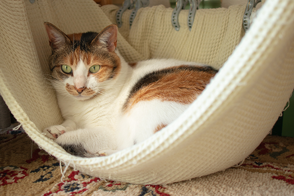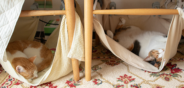 椅子の下の「バスタオル渡しただけハンモック」、猫ズの人気スポットに。