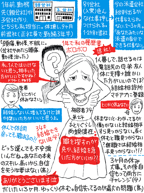 9ヶ月前に三年半勤務の正社員の職を辞職、心身病んでしまったが、「誰かと一緒にいたほうがいいのでは?」と思い立ち結婚相談所、街アプに登録。その後、今の勤務先の派遣会社も辞めてしまった。