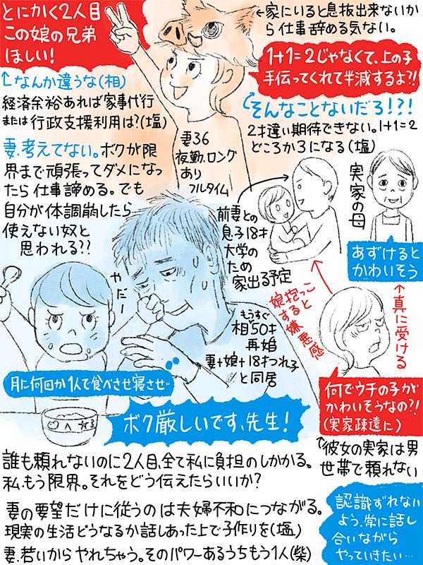 仕事辞める気ない妻、今も月に何回か相談者が保育園に迎えに行き食べさせ寝させ、二人だととんでもないことになる。50手前で体力も衰えこの子の将来大丈夫?と思うところもあるのに二人目。私としては限界、それを妻へどう伝えたら?という、もうすぐ50歳男性のご相談。