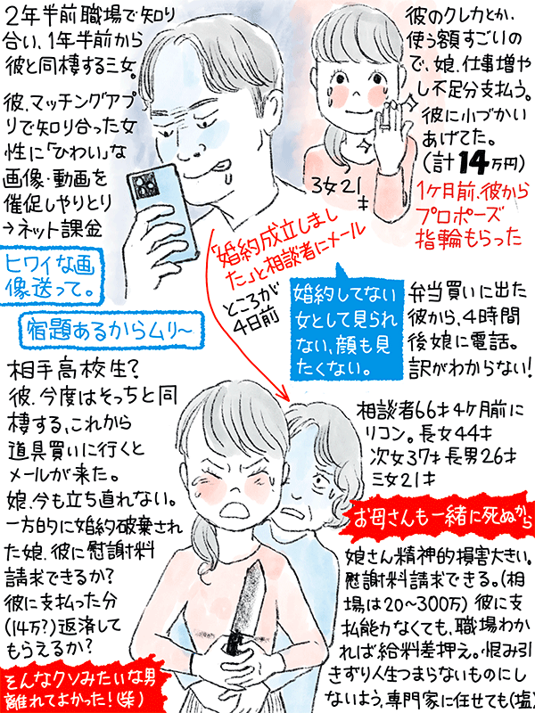 一年半同棲した彼と1ヶ月前に婚約した三女だが、4日前に彼から一方的に婚約破棄された。