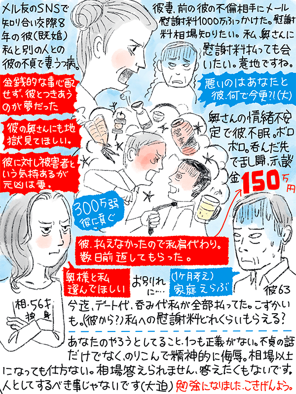 彼に慰謝料請求できるか?彼のクレカ代など補填したお金(と小遣い)を返してもらえるか?という66歳女性のご相談。