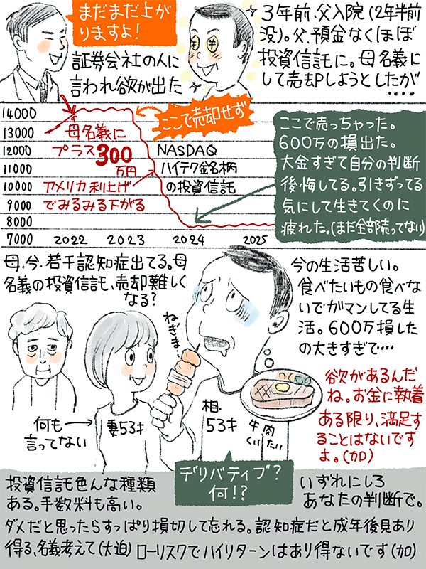 2年半前、父が大腿骨骨折で入院。入院費の問題で父の預金を調べたらほぼ無し、ほとんど投資信託だった。