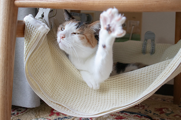 椅子の脚にバスタオル渡してハンモック作ってみた。