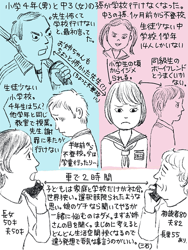 孫二人が不登校に。小四男子の孫は先生が怖くて半年不登校、中三女子の孫は、同級生のボーイフレンドとうまくいかなくなり1ヶ月不登校。