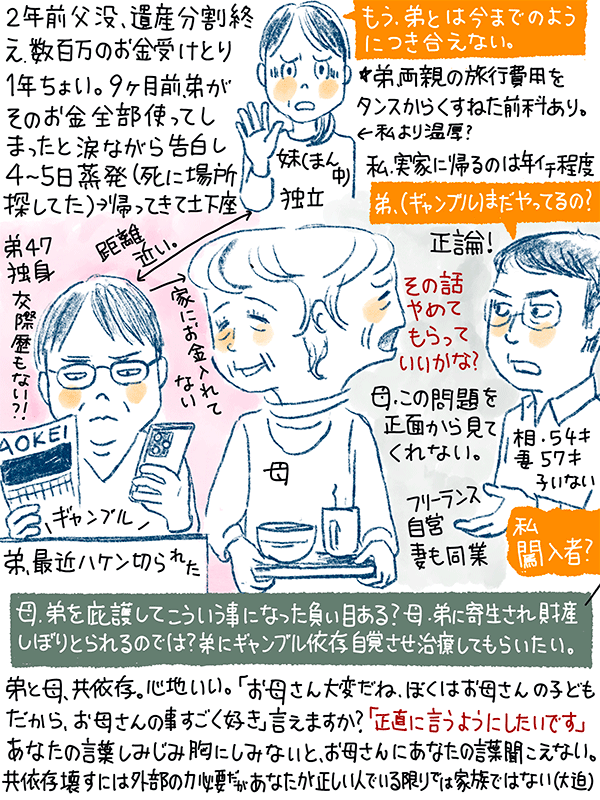 弟が以前からギャンブル依存。一年ちょっと前に父から相続したお金も数ヶ月で使い果たしてしまった。私は正論をはっきり言うタイプの人間だが、弟と実家で同居している母は、この問題に正面から答えてくれない。