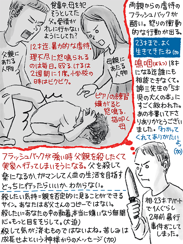 小学生の時に両親から受けた虐待のフラッシュバックが酷い。怒りで衝動的な行動が出てしまい、二年前に暴行事件を起こしてしまった。